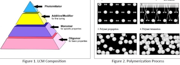 光固化材料通常由五种基本元素组成:光引发剂、添加剂、改性剂、单体和低聚物(图 1)。当 LCM 中的光引发剂暴露于具有适当光谱输出的光能源时,紫外线 (UV)光固化过程就开始了。如图 2 所示,LCM 的分子分裂成自由基(引发),然后开始与单体、低聚物和其他成分形成聚合物链(传播),直到所有成分都形成固体聚合物(终止)。在充分暴露于光线后,液体 LCM 会在几秒钟内聚合或固化。